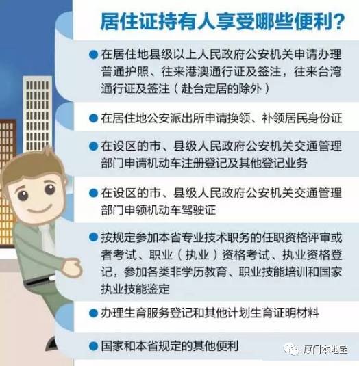 2016年12月1日起,针对居住证,涉及出入境、交管等业务政策也出现了新变化,将来持居住证的来厦人员在多个方面逐步与本市户籍居民同享便利。