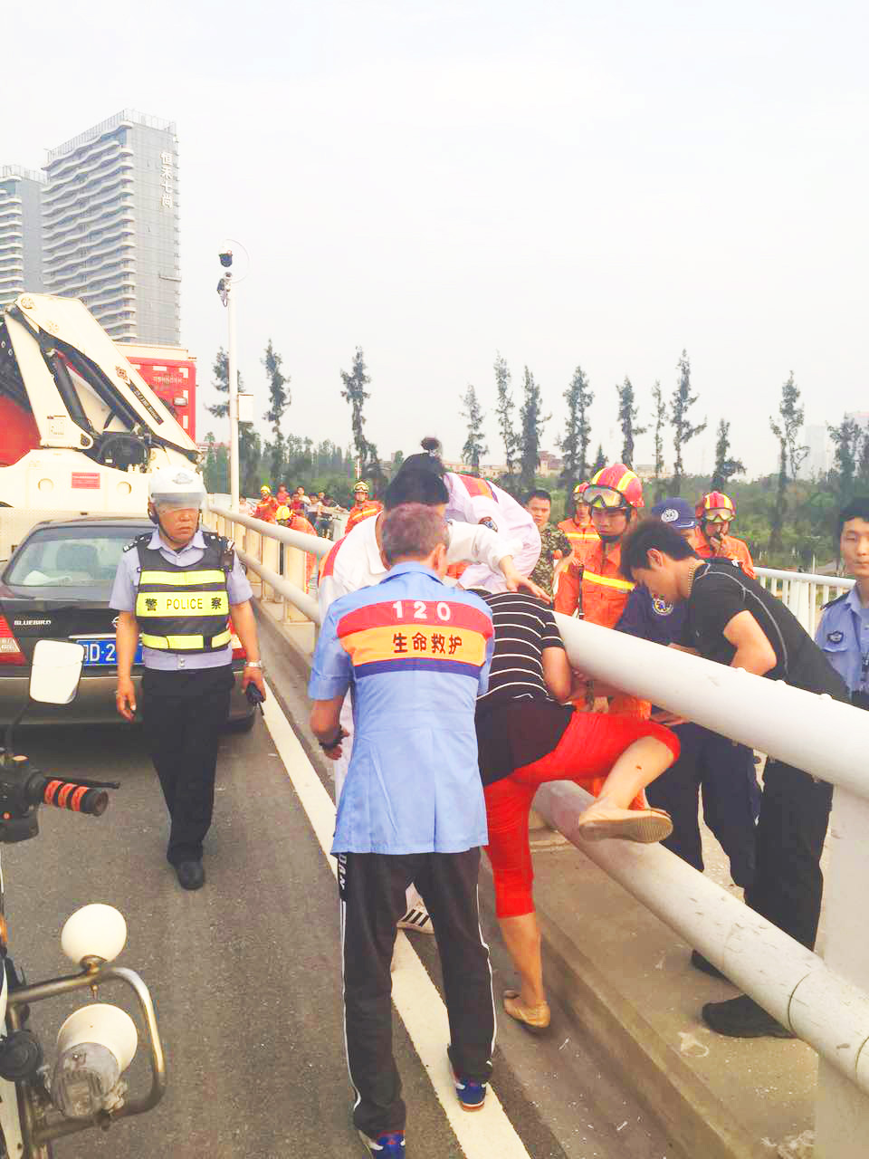 接报后我司禾山中队协警队长唐财宝带领多名协警,紧急赶往事发现场参与救援,与消防官兵和派出所民警等密切配合,成功救下轻生女子。我司协警在现场指挥交通,减轻路面压力,保证了救援工作的顺利进行。