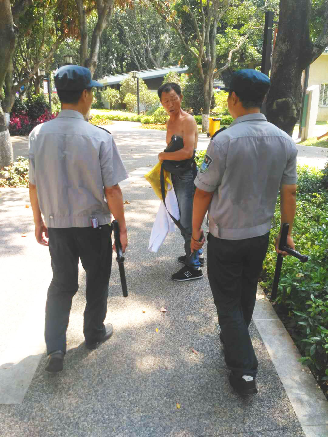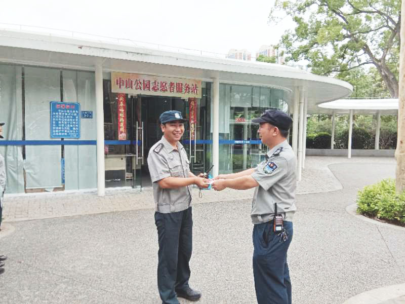 2018年5月22号下午,在中山公园孙中山铜像旁、老人活动区域附近,两名酒鬼因现场喝酒问题发生口角,后又升级动手打架,头两回合两人都赤手空拳不分胜负,此时,现场聚焦了许多围观群众,但无人敢上前劝架。所幸我司常驻孙中山铜像区域的保安员吴华兴发现这一情况后,沉着冷静地对两人进行劝阻并报警,但两名酒鬼越打越兴奋,其中一人抄起桌上酒瓶,另一人则从随身背包里掏出一把刀,吴华兴见事态紧急,立即用手上的橡胶棒打落刀具,制止了一起流血事件的发生。吴华兴同时积极配合随后赶来的民警,没收刀具,并协同民警和其他巡逻队员控制两名酒鬼。