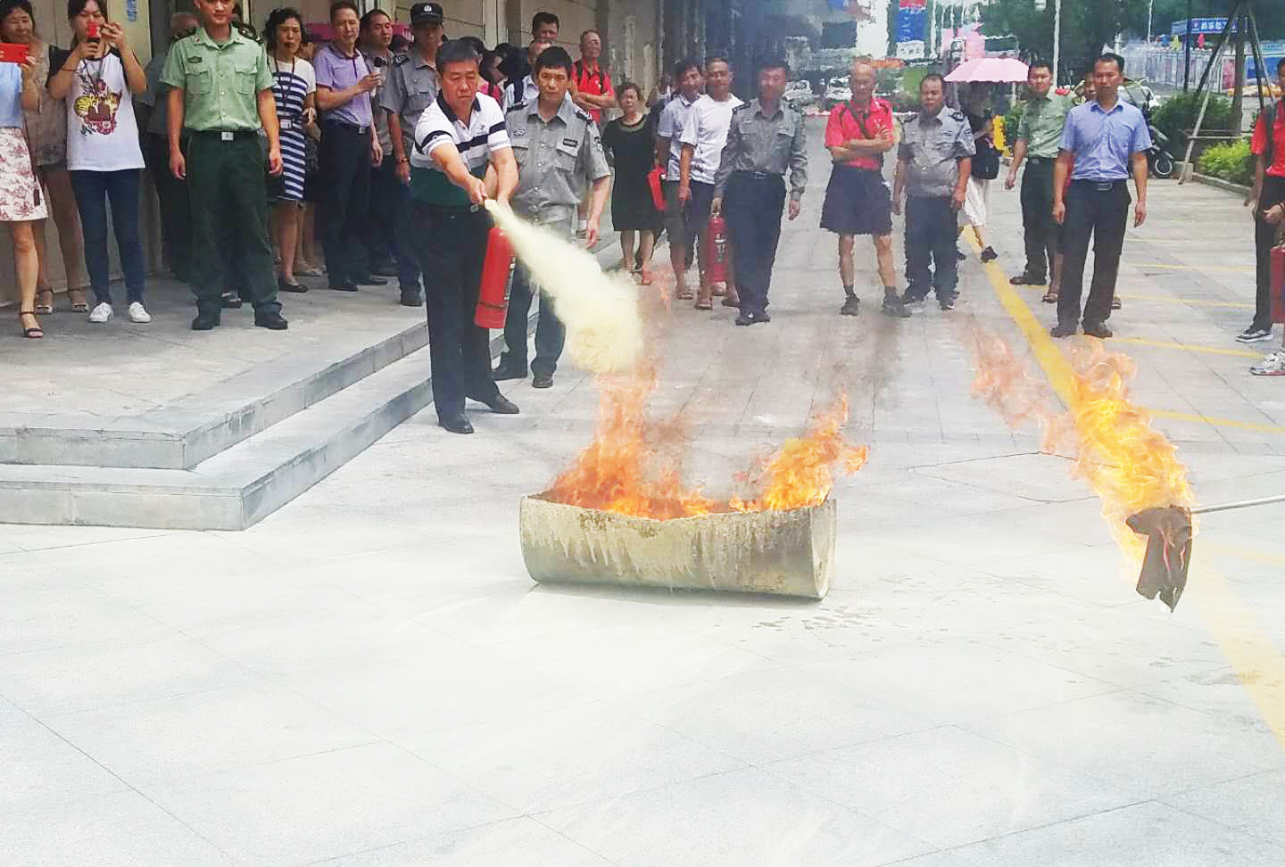 演练的最后环节是消防器材的使用,这次演练使用的是干粉灭火器,马垅消防中队的官兵向大家介绍了干粉灭火器的使用方法和灭火要点,并现场示范。现场人员纷纷拿起灭火器,进行实际操作,很快就学会了灭火器的使用方法。通过这次演练,不但进一步培养了工作人员的消防意识和火灾应对能力,也提高了群众的火灾防范理念。
