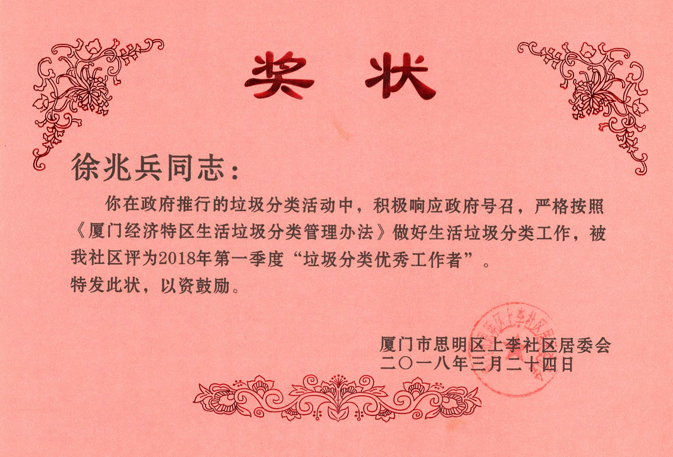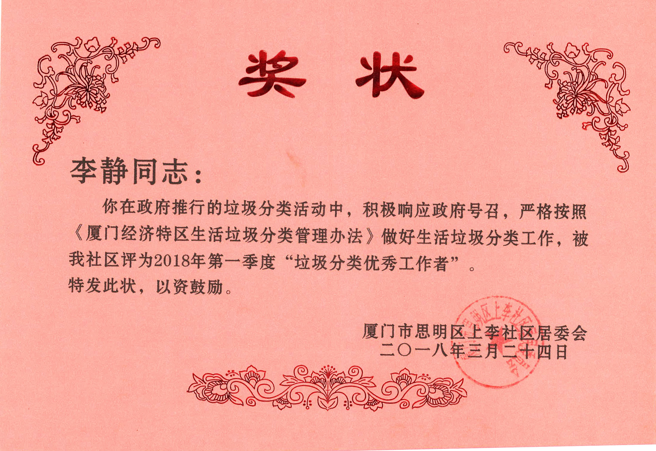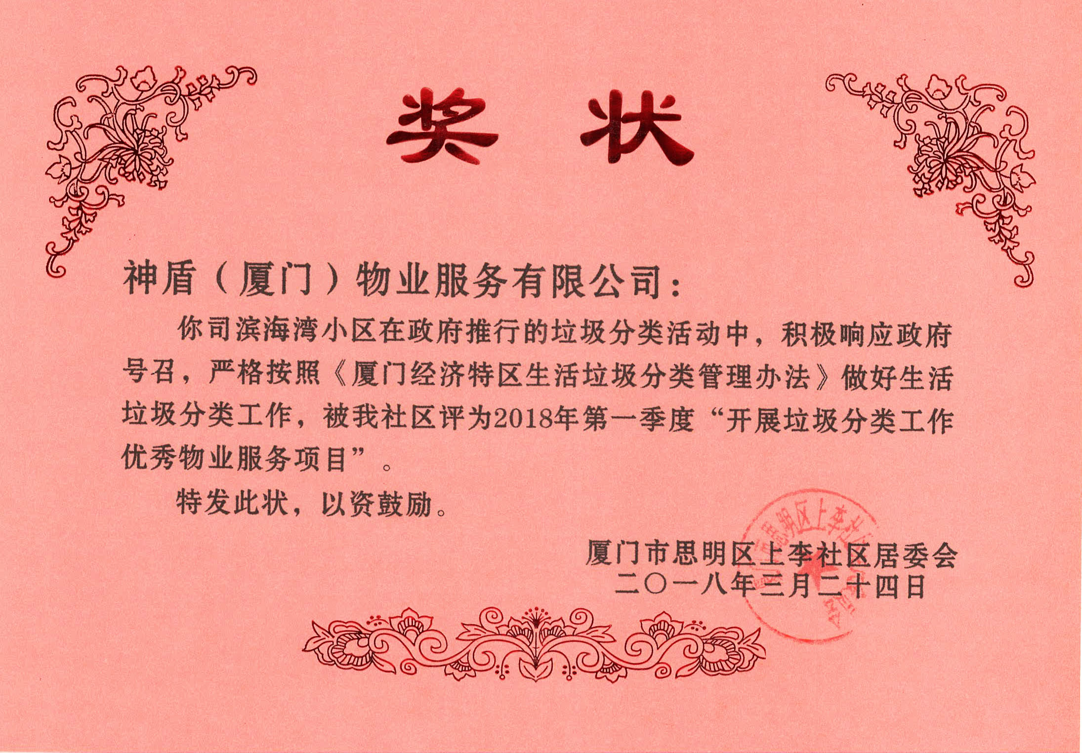 近日,我司驻厦门滨海湾花园小区的物业服务中心荣获嘉奖,因积极做好垃圾分类工作,该物业中心获得小李社区“开展垃圾分类工作优秀物业服务项目”的荣誉称号,中心工作人员李静、徐兆兵荣获“垃圾分类优秀工作者”荣誉称号。
