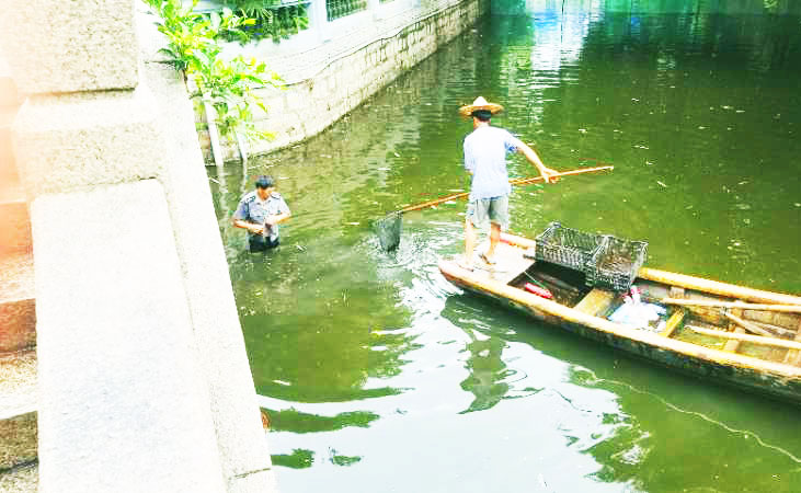 接到刘国能求助后,我司驻中山公园的保安员李世进、周春园立刻赶到湖边,并调来了一艘平时清运垃圾的小船,打算用打捞工具寻找刘国能的手机。但由于刘国能在手机落水的时候没有看清楚掉落的具体位置,再加上下雨导致湖水浑浊,两人打捞了十分钟仍未能找到刘国能的手机。