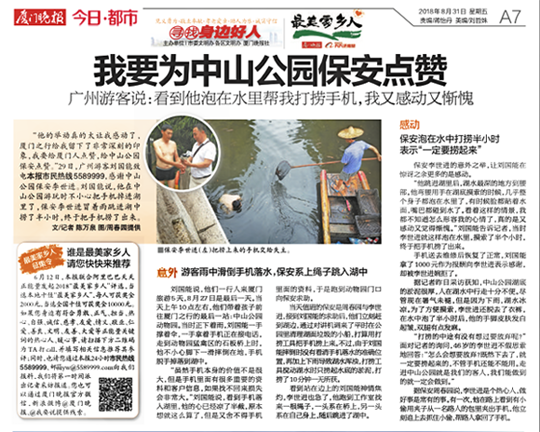 “他的举动真的太让我感动了,厦门之行给我留下了非常深刻的印象,我要给厦门人点赞,给中山公园保安点赞。”8月29日,广州游客刘国能致电厦门晚报,感谢我司驻中山公园保安李世进。27日上午,刘国能携家人中山公园游玩时不小心把手机掉进湖里了,当时正在执勤的我司保安队长李世进冒着雨跳进湖中捞了半小时,终于把手机捞了出来。