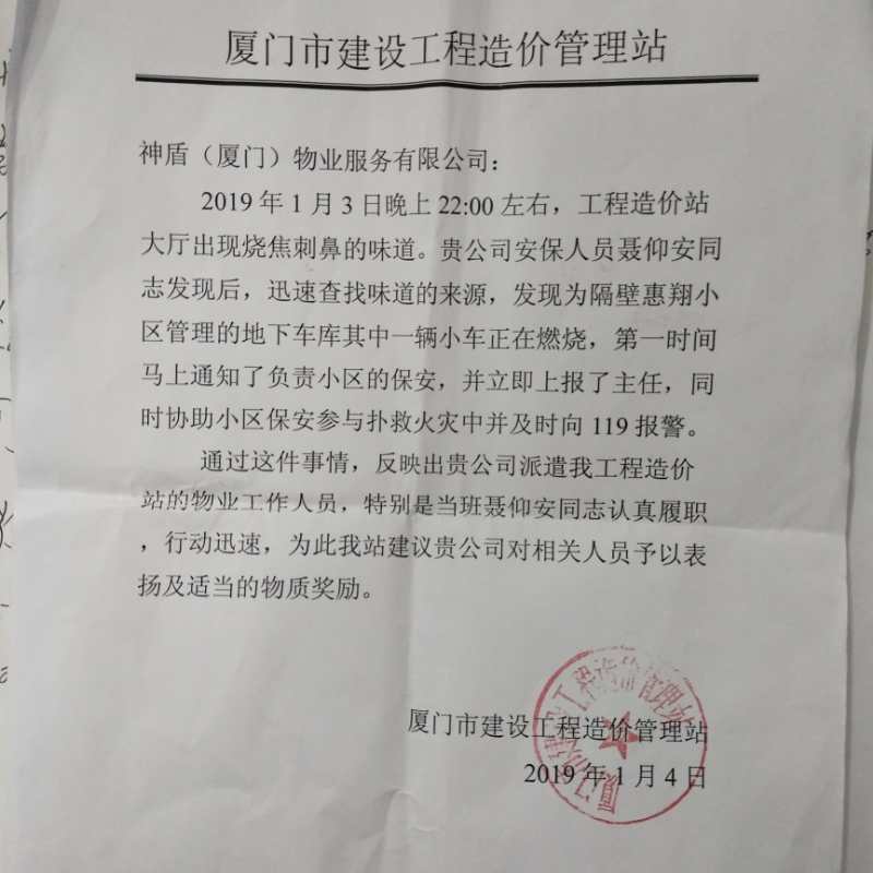 2019年1月3日晚,我司驻工程造价站保安员聂仰安在日常巡查中,闻到一股刺鼻的烧焦味道。聂仰安立刻在第一时间寻找气味的来源,发现是造价站隔壁小区的一辆停放在地下车库的车子正在燃烧。