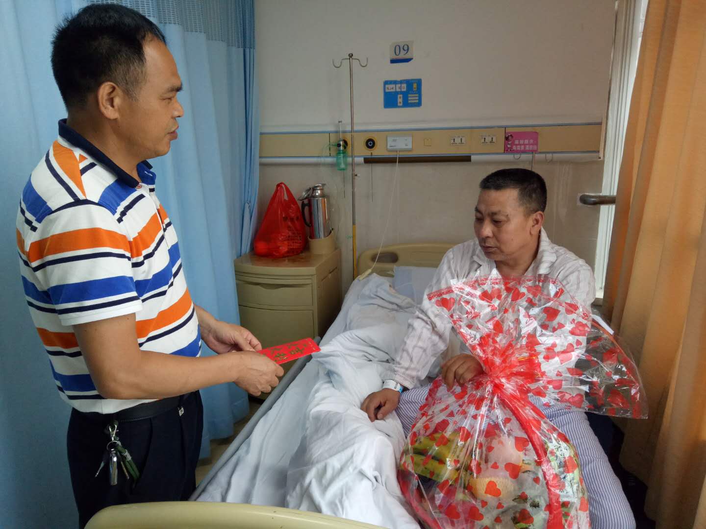 5月28日,受公司总经理和工会委托,徐荣祺、林建成两位经理到中山医院看望昨晚被打受伤的保安员陈小明,并送上慰问金。