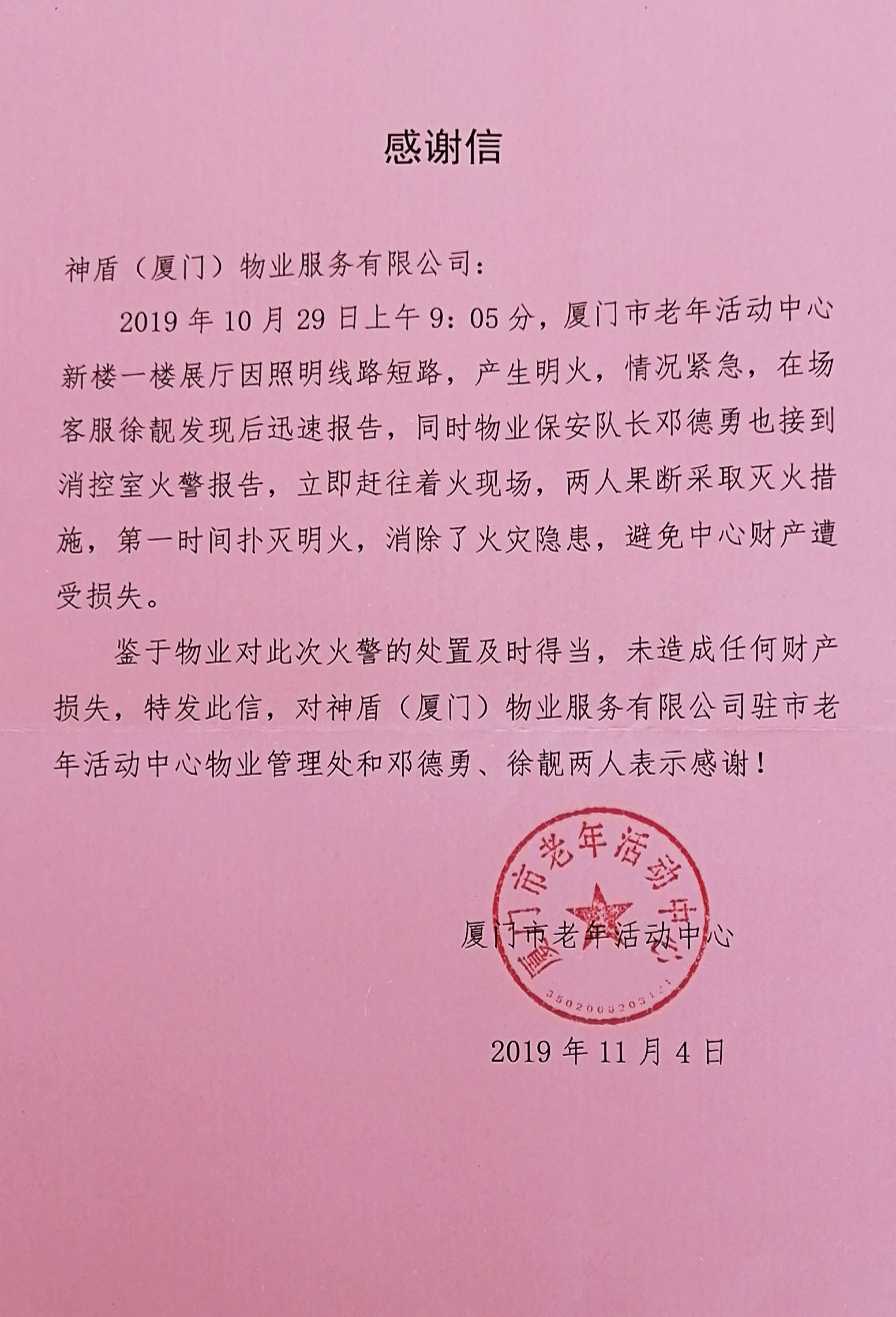 2019年10月29日上午9时,厦门市老年活动中心一建筑因照明线路短路,产生了明火,并出现了蔓延的势头,所幸我司驻该单位物业服务人员徐靓发现这一情况后,与随后赶到的我司驻该单位保安队长邓德勇,采取灭火措施,成功的扑灭明火,避免了业主单位的财产损失。