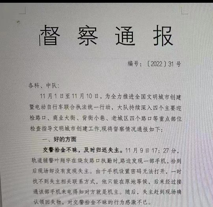 “感谢拾金不昧的的辅警同志!”11月9日,一位带着小孩散步的市民从辅警手中接过失而复得的手机后激动地说。