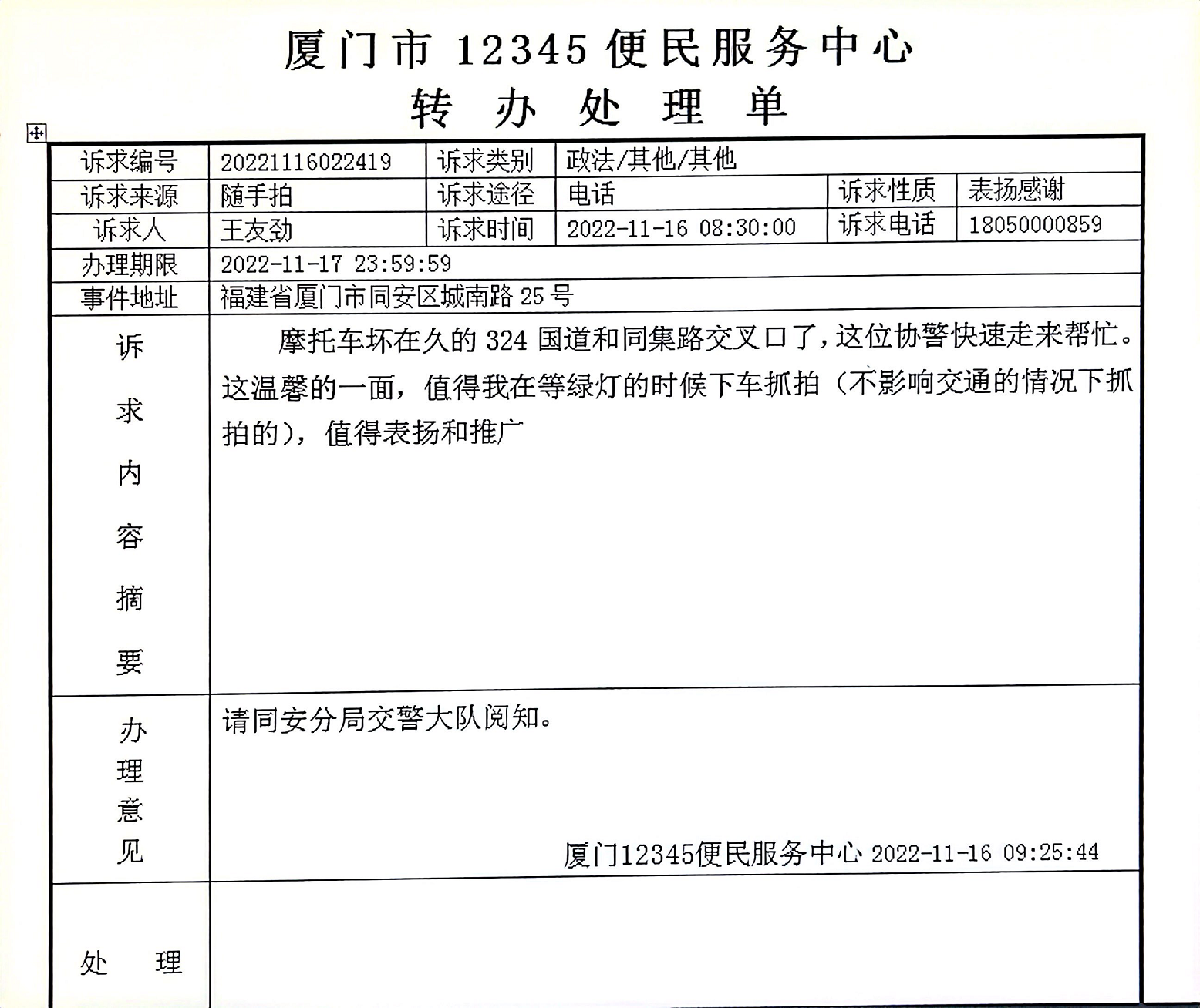 2022年11月16日上午8时30分,厦门市12345便民服务中心收到来自市民王友劲给一名好心协警的感谢信。