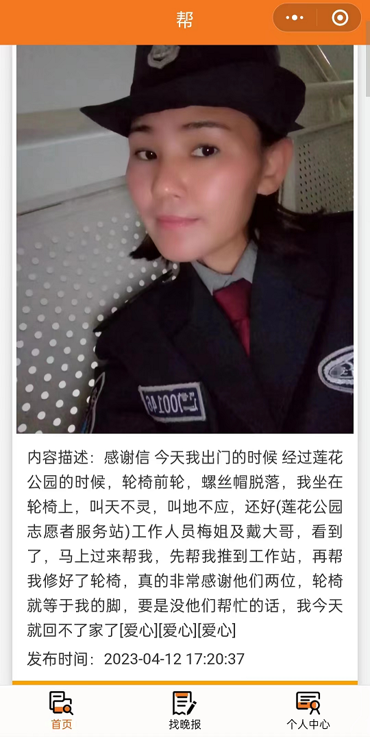 这事还得从4月12日说起。4月12日,胡先生坐轮椅出门经过莲花公园时,轮椅前轮螺丝帽突然脱落。由于胡先生身体残疾只能小心翼翼的坐在轮椅上,不敢动弹,情况十分危急。
