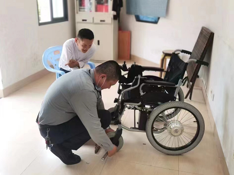 当时公园行人稀少,胡先生只能大声呼救。正在这时神盾(厦门)保安服务有限公司派驻莲花公园志愿者服务站的工作人员曹家梅和戴耀彬听到胡先生的呼救声,他们闻声赶来将胡先生推到工作站,并将轮椅修好。