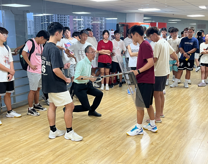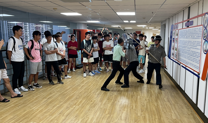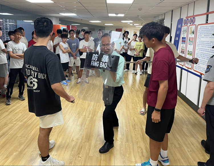 徐荣祺经理现场演示突发恐怖事件时如何自救,传授指导钢叉、盾牌、警棍、灭火器等防暴、防火器械的使用方法;示范演练攻击、双人配合、徒手反击等要领,并且现场邀请师生共同实操,让大家掌握基本的安防器材。