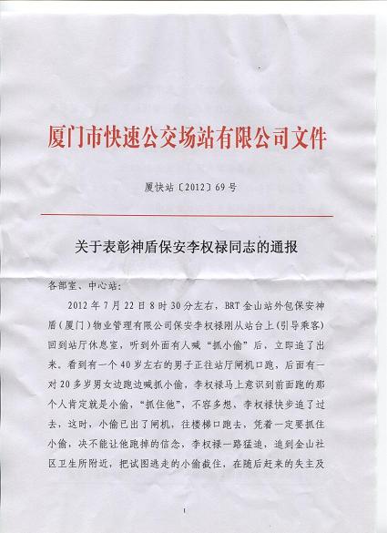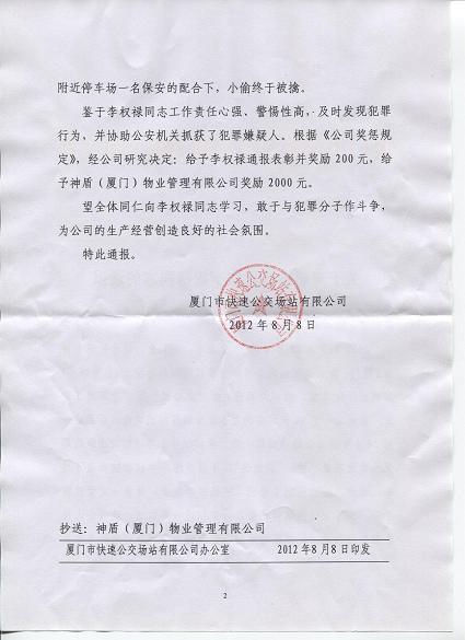 保安员李权禄能及时发现犯罪行为,均鉴于该同志有较强的工作责任心,较强的警惕性。感谢公交场站特别发文给予我司保安员李权禄予表彰并奖励。